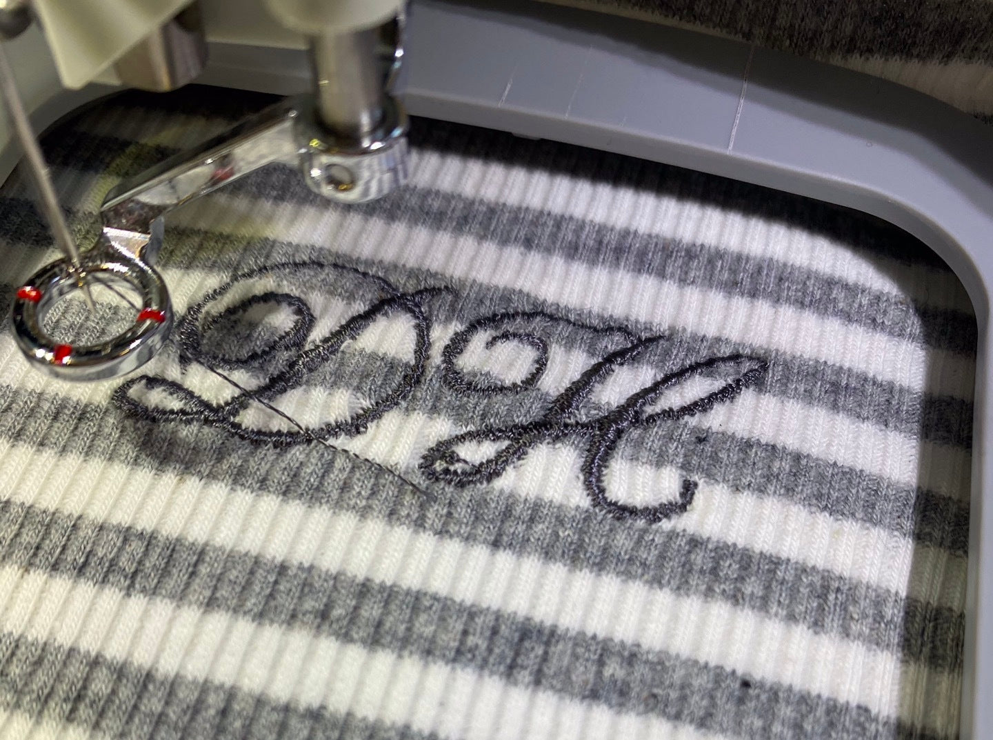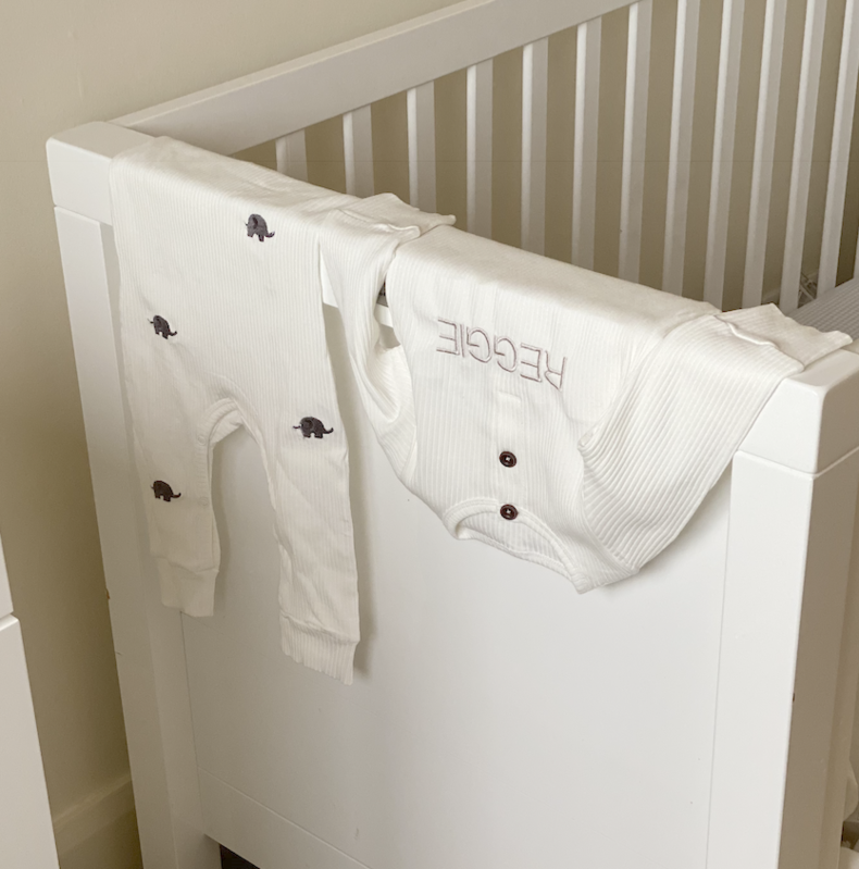 We personalise every item in house, with a small team silk stitch embroidering the clothing on the farm in the Yorkshire Wolds.